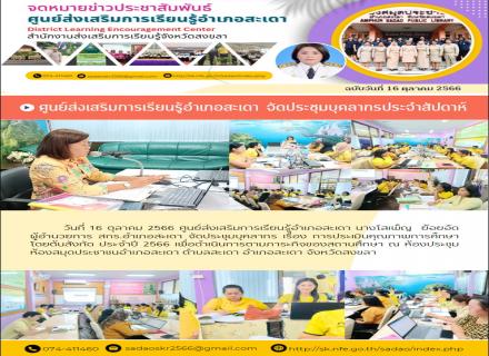 วันที่ 16 ตุลาคม 2566 ศูนย์ส่งเสริมการเรียนรู้อำเภอสะเดา นางโสเพ็ญ ย้อยอัด ผู้อำนวยการ สกร.อำเภอสะเดา จัดประชุมบุคลากร เรื่อง การประเมินคุณภาพการศึกษาโดยต้นสังกัด ประจำปี 2566 เพื่อดำเนินการตามภาระกิจของสถานศึกษา ณ ห้องประชุมห้องสมุดประชาชนอำเภอสะเดา
