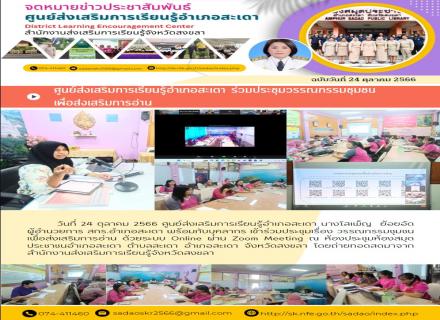 วันที่ 24 ตุลาคม 2566 ศูนย์ส่งเสริมการเรียนรู้อำเภอสะเดา นางโสเพ็ญ ย้อยอัด ผู้อำนวยการ สกร.อำเภอสะเดา พร้อมกับบุคลากร เข้าร่วมประชุมเรื่อง วรรณกรรมชุมชนเพื่อส่งเสริมการอ่าน ด้วยระบบ Online ผ่าน Zoom Meeting ณ ห้องประชุมห้องสมุดประชาชนอำเภอสะเดา ตำบลส