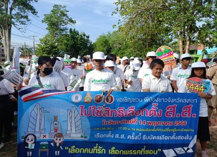 วันที่ 10 พฤษภาคม 2566 นางโสเพ็ญ ย้อยอัด ผู้อำนวยการ กศน.อำเภอสะเดา พร้อมคณะครู นำนักศึกษา กศน.ตำบลสำนักขาม เข้าร่วมกิจกรรมเดินรณรงค์เลือกตั้งสมาชิกสภาผู้แทนราษฎร จังหวัดสงขลา เป็นโครงการกิจกรรม \"6 สัปดาห์ประชาธิปไตยรณรงค์การเลือกตั้งสมาชิกสภาผู้แท