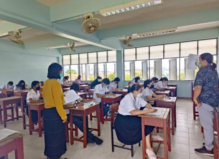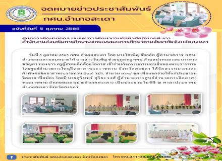 วันที่ 10 กันยายน 2565 กศน.อำเภอสะเดา โดยนางโสเพ็ญ ย้อยอัด ผู้อำนวยการ กศน.อำเภอสะเดา และคณะครู ดำเนินการจัดวัดผลสัมฤทธิ์ปลายภาคเรียน รายวิชาเลือกเสรี ภาคเรียนที่ 1 ปีการศึกษา 2565 มีนักษา กศน.เข้าสอบจำนวน 212 คน คิดเป็นร้อยละ 68.16 ของนักศึกษาเข้าสอบ สน