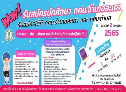 Wow ประชาสัมพันธ์ กศน.อำเภอสะเดา เปิดรับสมัครนักศึกษาใหม่ ประจำภาคเรียนที่ 2 ปีการศึกษา 2565 ตั้งแต่วันที่ 1 - 31 ตุลาคม 2565 เวลา 08.30 - 16.30 น. ไม่เว้นวันหยุดราชการ