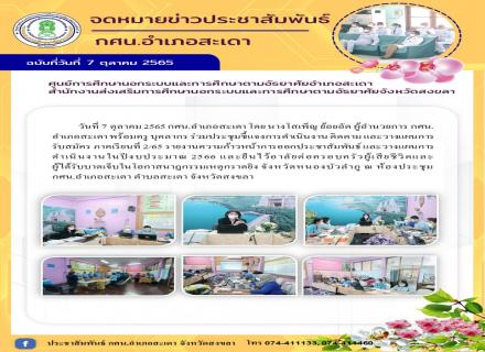 วันที่ 7 ตุลาคม 2565 กศน.อำเภอสะเดา โดย นางโสเพ็ญ ย้อยอัด ผู้อำนวยการ กศน.อำเภอสะเดา พร้อมครู บุคลากร ร่วมประชุมชี้แจงการดำเนินงาน ติดตาม และวางแผนการรับสมัคร ภาคเรียนที่ 2/65 รายงานความก้าวหน้าการออกประชาสัมพันธ์ และวางแผนการดำเนินงานในปีงบประมาณ 2566 แล