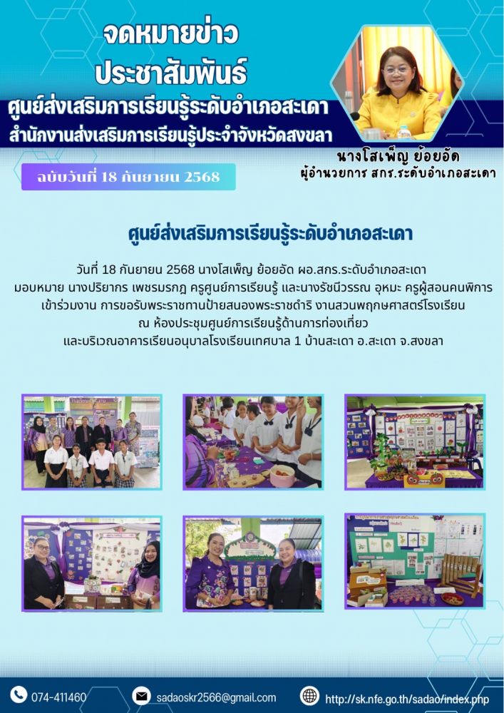 ศูนย์ส่งเสริมการเรียนรู้ระดับอำเภอสะเดา ร่วมต้อนรับคณะกรรมการเยี่ยมเยียนพิจารณาให้คะแนนสถานศึกษาฯ เพื่อขอรับพระราชทานป้ายสนองพระราชดำริในงานสวนพฤกษศาสตรโรงเรียน 19 / ก.ย. / 2568