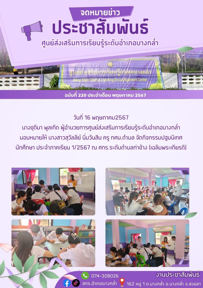 จัดกิจกรรมปฐมนิเทศนักศึกษา ประจำภาคเรียน 1/2567 ณ ศกร.ระดับตำบลท่าช้าง (เฉลิมพระเกียรติ)