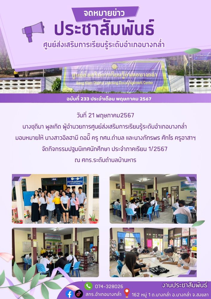 จัดกิจกรรมปฐมนิเทศนักศึกษา ประจำภาคเรียน 1/2567 ณ ศกร.ระดับตำบลบ้านหาร