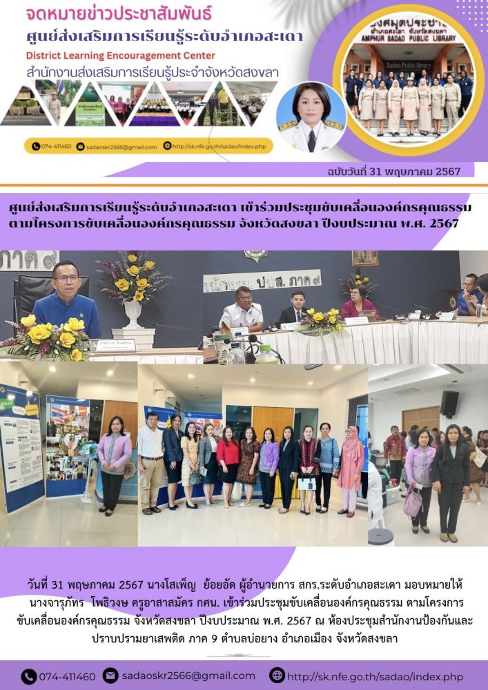 ศูนย์ส่งเสริมการเรียนรู้ระดับอำเภอสะเดา เข้าร่วมประชุมขับเคลื่อนองค์กรคุณธรรม ตามโครงการขับเคลื่อนองค์คุณธรรม จังหวัดสงขลา ปีงบประมาณ พ.ศ. 2567