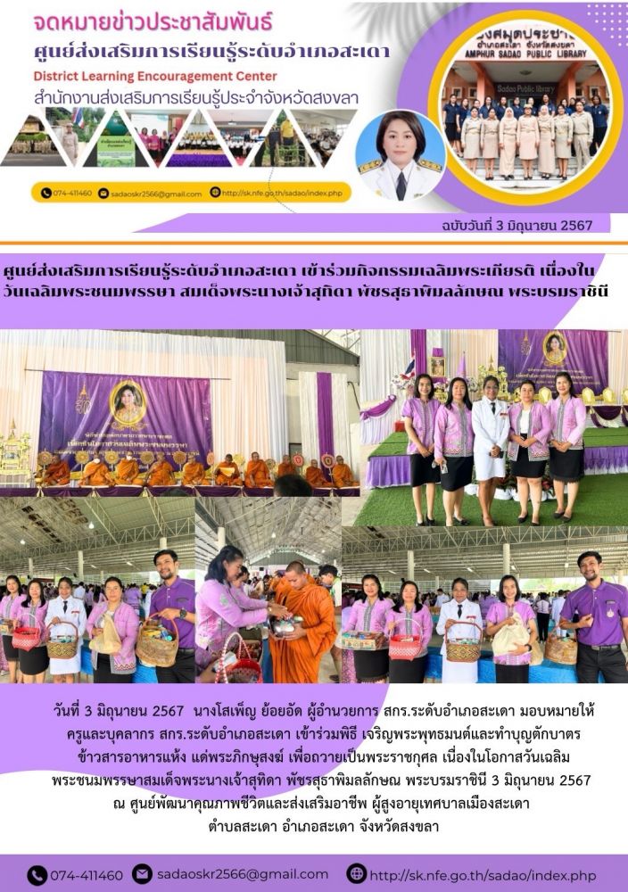 ศูนย์ส่งเสริมการเรียนรู้ระดับอำเภอสะเดา เข้าร่วมกิจกรรมเฉลิมพระเกียรติ เนื่องใน วันเฉลิมพระชนมพรรษา สมเด็จพระนางเจ้าสุทิดา พัชรสุธาพิมลลักษณ พระบรมราชินี