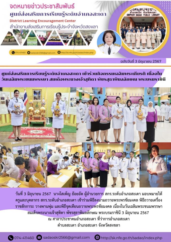 ศูนย์ส่งเสริมการเรียนรู้ระดับอำเภอสะเดา เข้าร่วมกิจกรรมเฉลิมพระเกียรติ เนื่องใน วันเฉลิมพระชนมพรรษา สมเด็จพระนางเจ้าสุทิดา พัชรสุธาพิมลลักษณ พระบรมราชินี