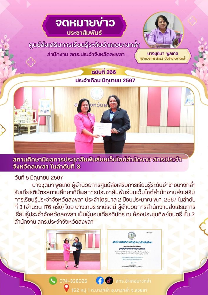 รับเกียรติบัตรสถานศึกษาที่มีผลการประชาสัมพันธ์บนเว็บไซต์สำนักงานส่งเสริมการเรียนรู้ประจำจังหวัดสงขลา ประจำไตรมาส 2