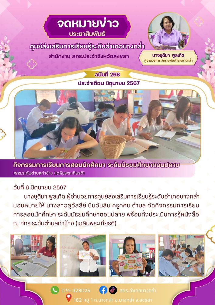 กิจกรรมการเรียนการสอนนักศึกษา ระดับมัธยมศึกษาตอนปลาย พร้อมทั้งประเมินการรู้หนังสือ ณ ศกร.ระดับตำบลท่าช้าง(เฉลิมพระเกียรติ)