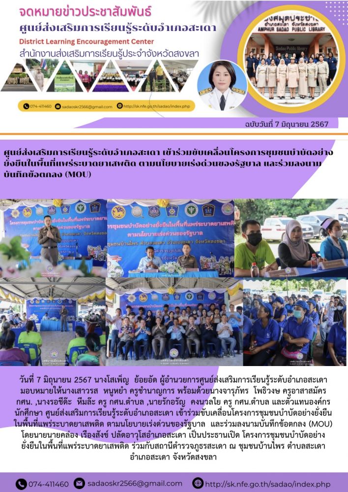 ศูนย์ส่งเสริมการเรียนรู้ระดับอำเภอสะเดา เข้าร่วมขับเคลื่อนโครงการชุมชนบำบัดอย่างยั่งยืนในพื้นที่แพร่ระบาดยาเสพติด ตามนโยบายเร่งด่วนของรัฐบาล และร่วมลงนามบันทึกข้อตกลง (MOU)