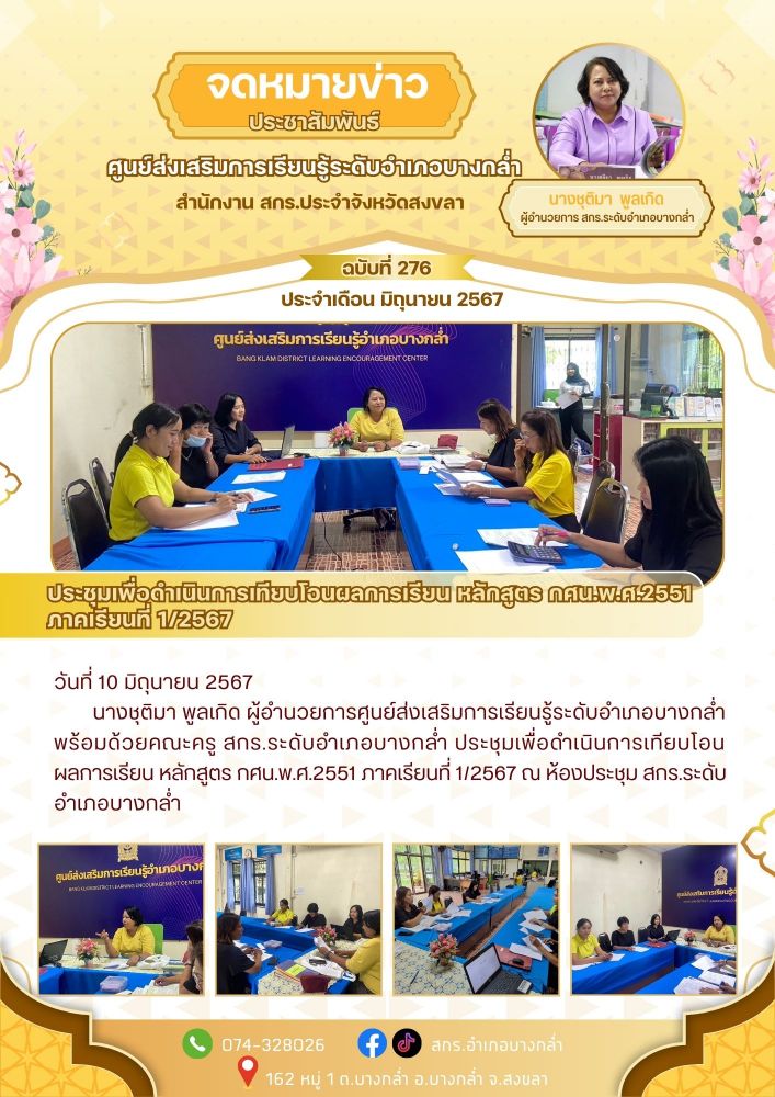 เข้าร่วมโครงการประชุมเชิงปฏิบัติการการดำเนินงานพัฒนาระบบการประกันคุณภาพภายในและนำมาตรฐานการศึกษาตามที่กระทรวงศึกษาธิการประกาศกำหนดไปใช้ในการประกันคุณภาพภายในสถานศึกษา สังกัดสำนักงานส่งเสริมการเรียนรู้ประจำจังหวัดสงขลา 6 / ต.ค. / 2568