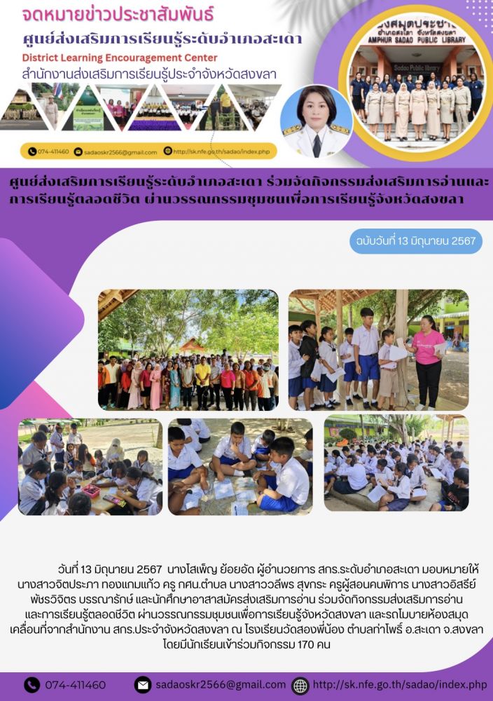 ศูนย์ส่งเสริมการเรียนรู้ระดับอำเภอสะเดา ร่วมจัดกิจกรรมส่งเสริมการอ่านและการเรียนรู้ตลอดชีวิต ผ่านวรรณกรรมชุมชนเพื่อการเรียนรู้จังหวัดสงขลา