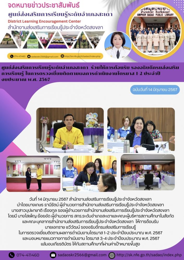 ศูนย์ส่งเสริมการเรียนรู้ระดับอำเภอสะเดา ร่วมให้การต้อนรับ รองอธิบดีกรมส่งเสริมการเรียนรู้ ในการตรวจเยี่ยมติดตามผลการดำเนินงานไตรมาส 1-2 ประจำปี งบประมาณ พ.ศ. 2567