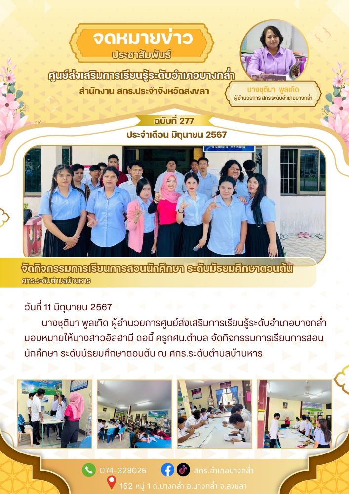 จัดกิจกรรมการเรียนการสอนนักศึกษา ระดับมัธยมศึกษาตอนต้น ศกร.ระดับตำบลบ้านหาร