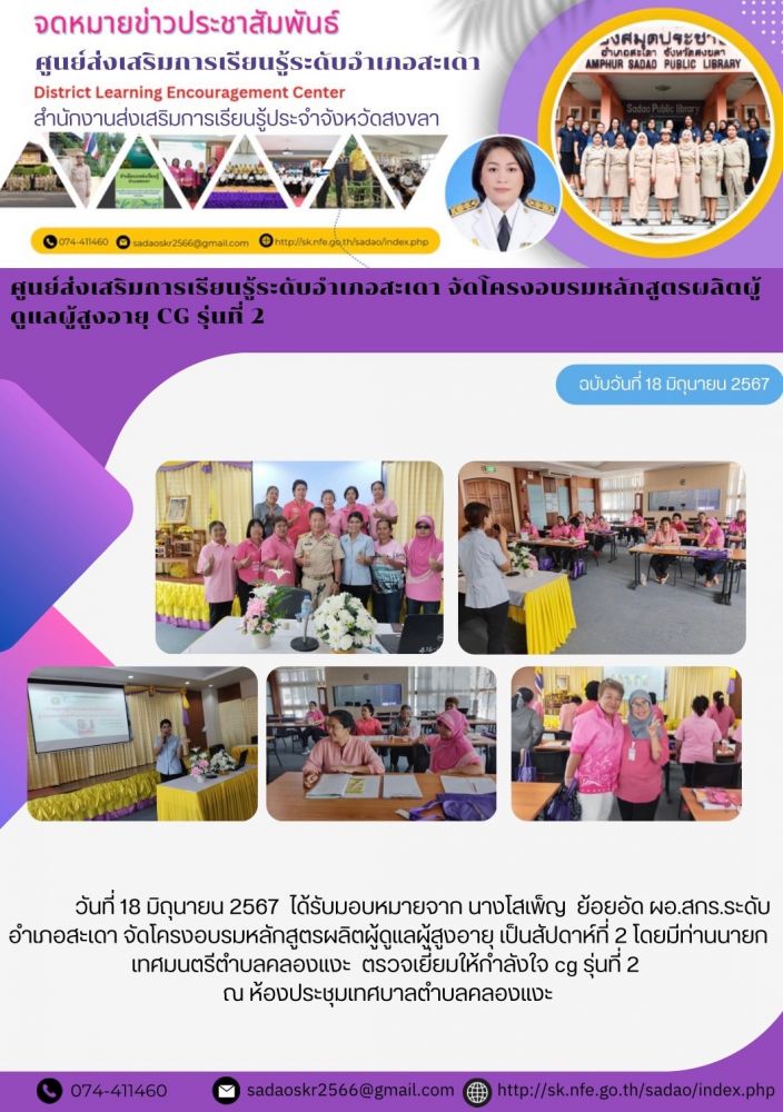 ศูนย์ส่งเสริมการเรียนรู้ระดับอำเภอสะเดา จัดโครงอบรมหลักสูตรผลิตผู้ดูแลผู้สูงอายุ CG รุ่นที่ 2