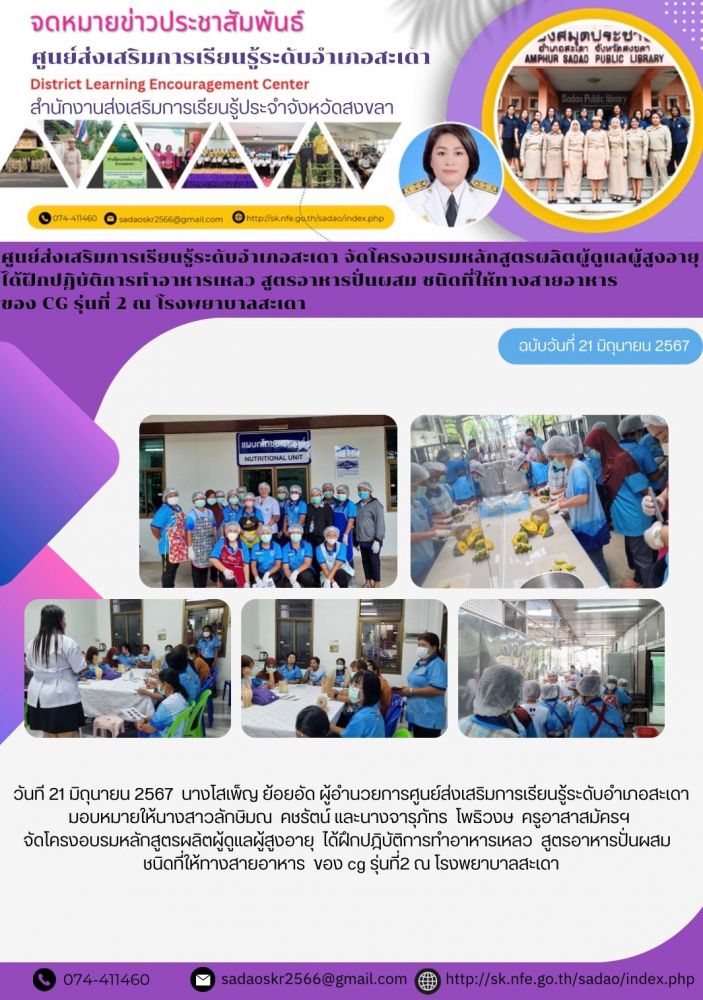 ศูนย์ สกร.ระดับอำเภอสะเดา ศูนย์ส่งเสริมการเรียนรู้ระดับอำเภอสะเดา จัดโครงอบรมหลักสูตรผลิตผู้ดูแลผู้สูงอายุ ได้ฝึกปฎิบัติการทำอาหารเหลว สูตรอาหารปั่นผสม ชนิดที่ให้ทางสายอาหาร ของ CG รุ่นที่ 2 ณ โรงพยาบาลสะเดา