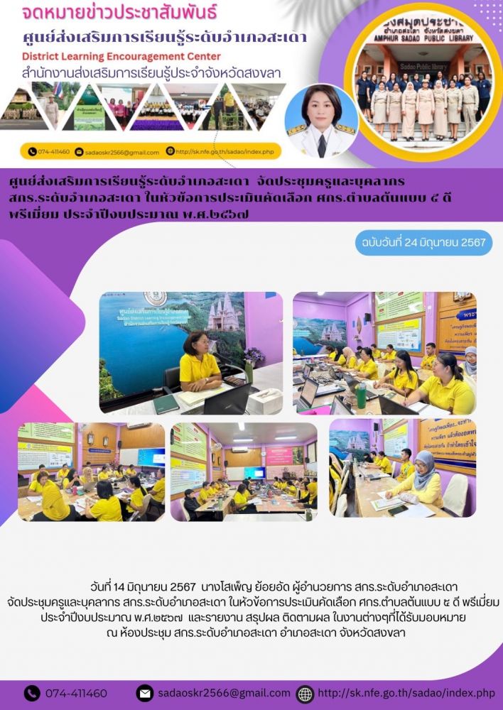 ศูนย์ส่งเสริมการเรียนรู้ระดับอำเภอสะเดา จัดประชุมครูและบุคลากร สกร.ระดับอำเภอสะเดา ในหัวข้อการประเมินคัดเลือก ศกร.ตำบลต้นแบบ ๕ ดี พรีเมี่ยม ประจำปีงบประมาณ พ.ศ.๒๕๖๗