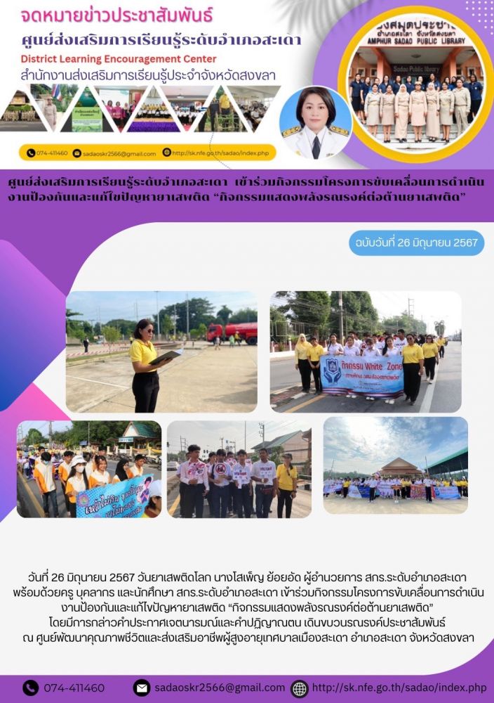 ศูนย์ส่งเสริมการเรียนรู้ระดับอำเภอสะเดา เข้าร่วมกิจกรรมโครงการขับเคลื่อนการดำเนินงานป้องกันและแก้ไขปัญหายาเสพติด “กิจกรรมแสดงพลังรณรงค์ต่อต้านยาเสพติด”