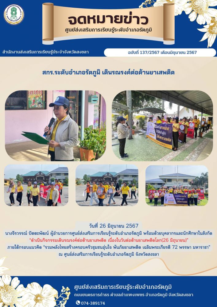 ศูนย์ สกร.ระดับอำเภอรัตภูมิ พัฒน์ ผู้อำนวยการศูนย์ส่งเสริมการเรียนรู้ระดับอำเภอรัตภูมิ พร้อมด้วยบุคลากรและนักศึกษาในสังกัด ดำเนินกิจกรรมเดินรณรงค์ต่อต้านยาเสพติด เนื่องในวันต่อต้านยาเสพติดโลก(26 มิถุนายน)
