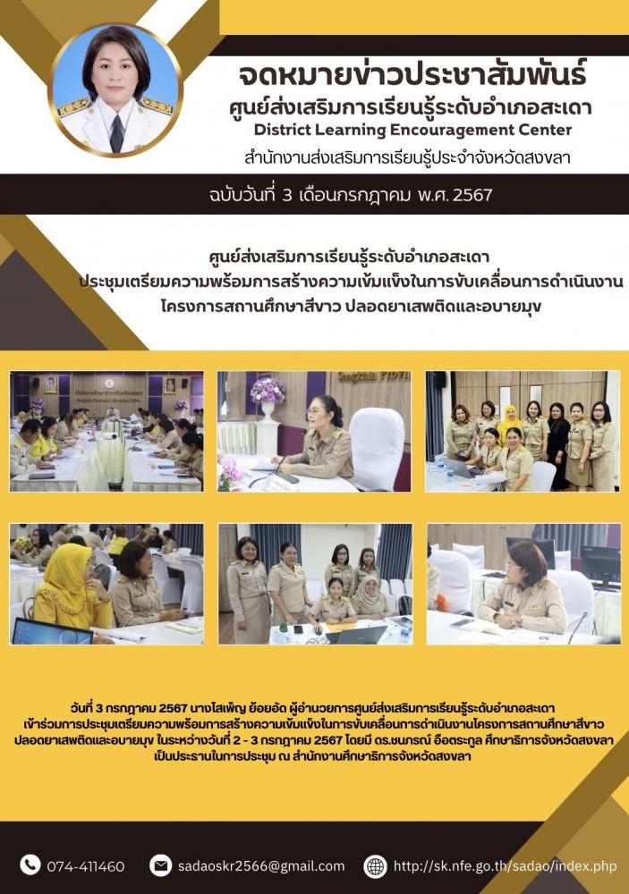 ศูนย์ส่งเสริมการเรียนรู้ระดับอำเภอสะเดา ประชุมเตรียมความพร้อมการสร้างความเข้มแข็งในการขับเคลื่อนการดำเนินงาน โครงการสถานศึกษาสีขาว ปลอดยาเสพติดและอบายมุข