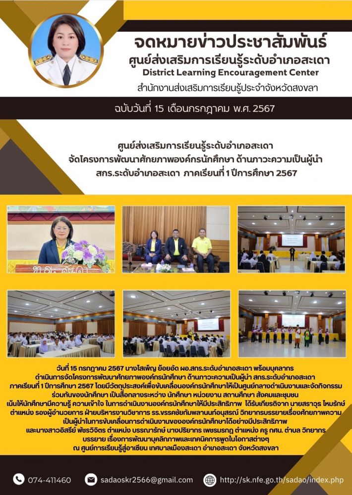ศูนย์ส่งเสริมการเรียนรู้ระดับอำเภอสะเดา ร่วมต้อนรับคณะกรรมการเยี่ยมเยียนพิจารณาให้คะแนนสถานศึกษาฯ เพื่อขอรับพระราชทานป้ายสนองพระราชดำริในงานสวนพฤกษศาสตรโรงเรียน 19 / ก.ย. / 2568