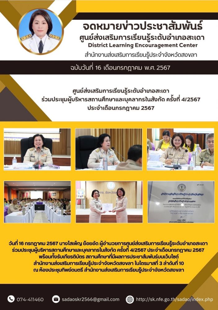 ศูนย์ส่งเสริมการเรียนรู้ระดับอำเภอสะเดา ร่วมประชุมผู้บริหารสถานศึกษาและบุคลากรในสังกัด ครั้งที่ 4/2567 ประจำเดือนกรกฎาคม 2567