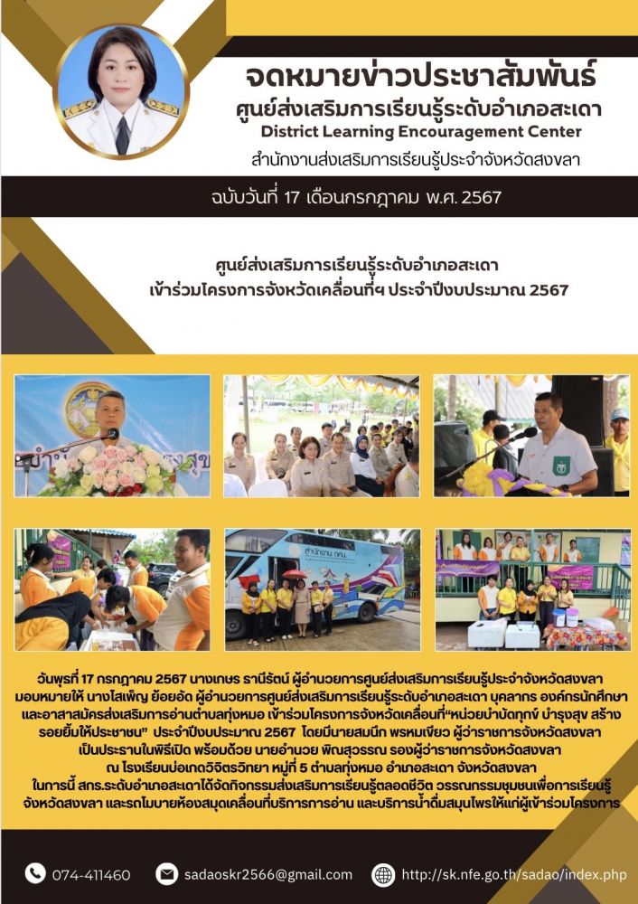 ศูนย์ส่งเสริมการเรียนรู้ระดับอำเภอสะเดา เข้าร่วมโครงการจังหวัดเคลื่อนที่ฯ ประจำปีงบประมาณ 2567
