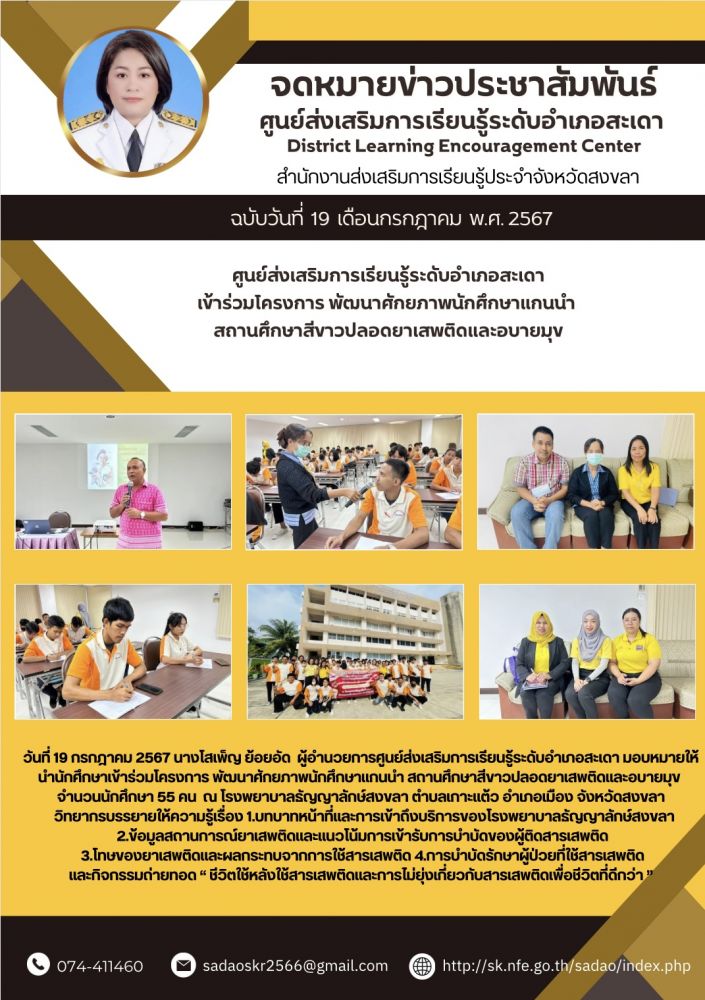ศูนย์ส่งเสริมการเรียนรู้ระดับอำเภอสะเดา เข้าร่วมโครงการ พัฒนาศักยภาพนักศึกษาแกนนำ สถานศึกษาสีขาวปลอดยาเสพติดและอบายมุข