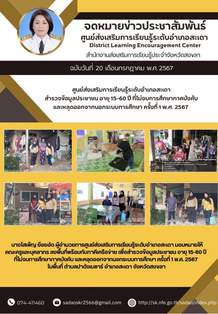 ศูนย์ส่งเสริมการเรียนรู้ระดับอำเภอสะเดา สำรวจข้อมูลประชาชน อายุ 15-60 ปี ที่ไม่จบการศึกษาภาคบังคับ และหลุดออกจากนอกระบบการศึกษา ครั้งที่ 1 พ.ศ. 2567