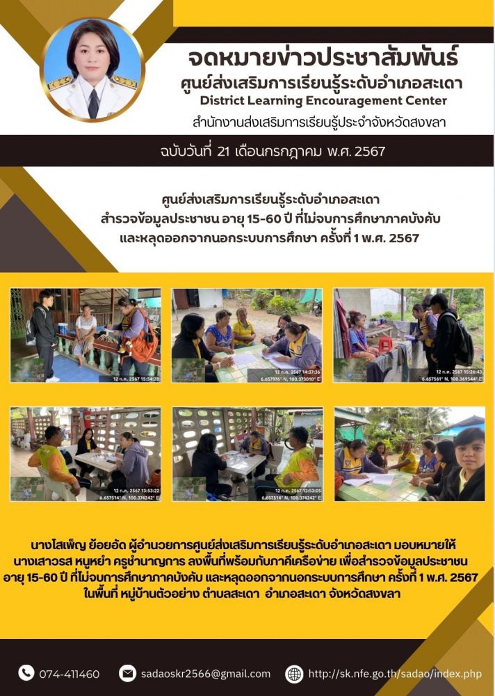 ศูนย์ส่งเสริมการเรียนรู้ระดับอำเภอสะเดา สำรวจข้อมูลประชาชน อายุ 15-60 ปี ที่ไม่จบการศึกษาภาคบังคับ และหลุดออกจากนอกระบบการศึกษา ครั้งที่ 1 พ.ศ. 2567