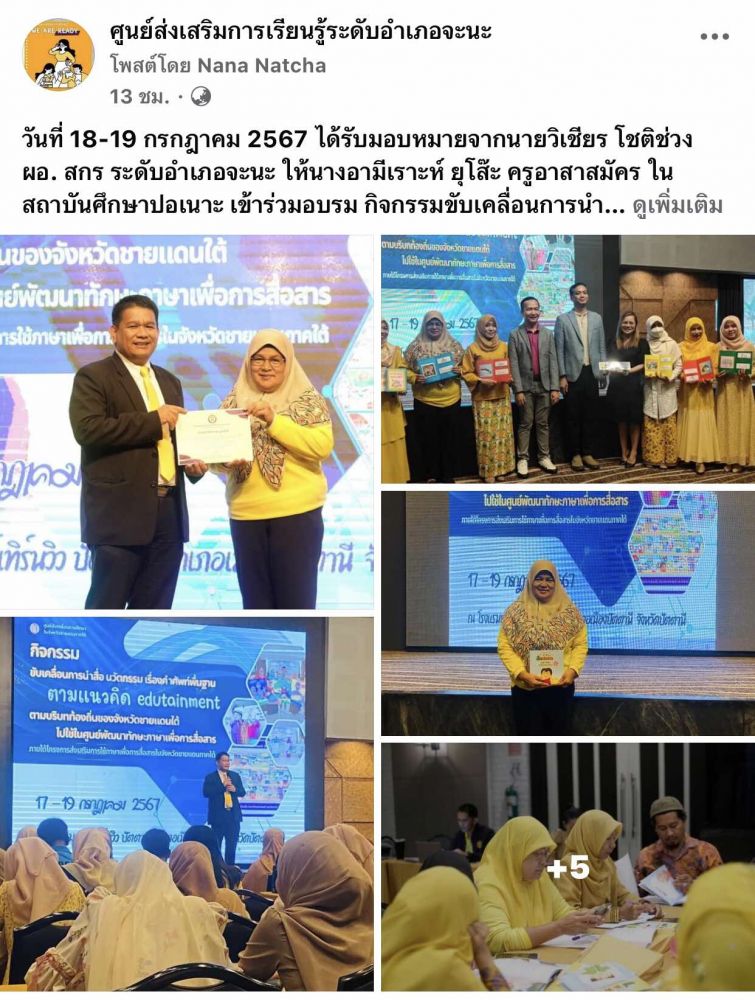 ศูนย์ สกร.ระดับอำเภอจะนะ เข้าร่วมอบรม กิจกรรมขับเคลื่อนการนำสื่อ นวัตกรรม เรื่องคำศัพท์พื้นฐานตามแนวคิด edutainกาent ตามบริบทท้องถิ่นของจังหวัดชายแดนภาคใต้ไปใช้ในศูนย์พัฒนาทักษะภาษาเพื่อการสื่อสาร ของ ศูนย์ขับเคลื่อนการศึกษาในจังหวัดชายแดนภาคใต้