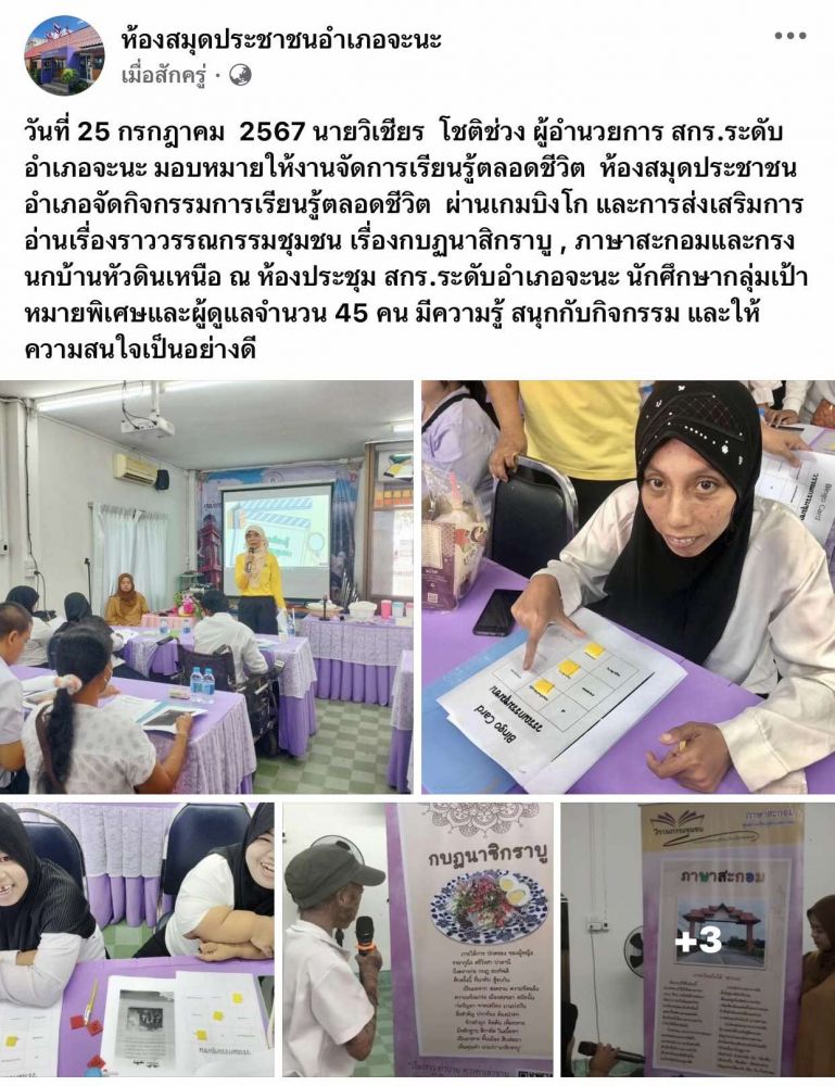 ศูนย์ สกร.ระดับอำเภอจะนะ งานจัดการเรียนรู้ตลอดชีวิต ห้องสมุดประชาชนอำเภอจัดกิจกรรมการเรียนรู้ตลอดชีวิต ผ่านเกมบิงโก และการส่งเสริมการอ่านเรื่องราววรรณกรรมชุมชน เรื่องกบฏนาสิกราบู , ภาษาสะกอมและกรงนกบ้านหัวดินเหนือ ณ ห้องประชุม สกร.ระดับอำเภอจะนะ