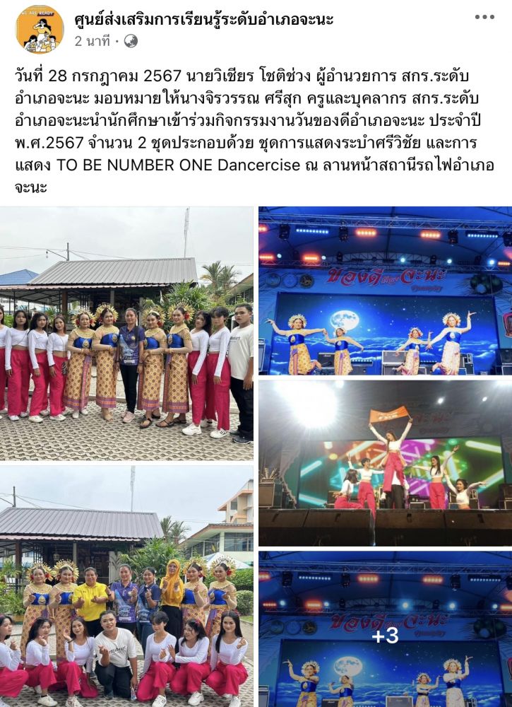 ศูนย์ สกร.ระดับอำเภอจะนะ วันที่ 28 กรกฎาคม 2567 นายวิเชียร โชติช่วง ผู้อำนวยการ สกร.ระดับอำเภอจะนะ มอบหมายให้นางจิรวรรณ ศรีสุก ครูและบุคลากร สกร.ระดับอำเภอจะนะนำนักศึกษาเข้าร่วมกิจกรรมงานวันของดีอำเภอจะนะ ประจำปี พ.ศ.2567 จำนวน 2 ชุดประกอบด้วย ชุดการแสดงระบำศรีวิชัย และการแสดง TO