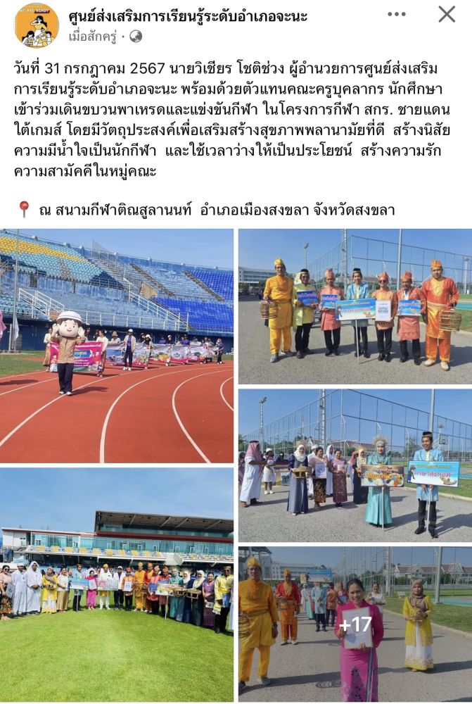 ศูนย์ สกร.ระดับอำเภอจะนะ วันที่ 31 กรกฎาคม 2567 นายวิเชียร โชติช่วง ผู้อำนวยการศูนย์ส่งเสริมการเรียนรู้ระดับอำเภอจะนะ พร้อมด้วยตัวแทนคณะครูบุคลากร นักศึกษาเข้าร่วมเดินขบวนพาเหรดและแข่งขันกีฬา ในโครงการกีฬา สกร. ชายแดนใต้เกมส์ โดยมีวัตถุประสงค์เพื่อเสริมสร้างสุขภาพพลานามัยที่ดี ส