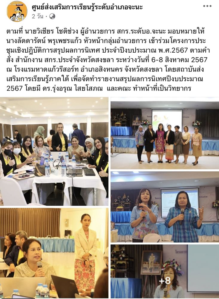 นางจีรวรรณ์ ปัตตะพัฒน์ ผู้อำนวยการศูนย์ส่งเสริมการเรียนรู้ระดับอำเภอจะนะ เข้าร่วมประชุมรับนโยบายและแนวทางการดำเนินงานส่งเสริมการเรียนรู้ ประจำปีงบประมาณ พ.ศ. 2569 พร้อมทั้งคณะบุคลากรสำนักงานส่งเสริมการเรียนรู้ประจำจังหวัดสงขลา ร่วมรับฟังนโยบายและแนวทางการ 7 / ต.ค. / 2568