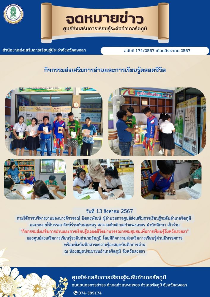 ศูนย์ สกร.ระดับอำเภอรัตภูมิ บรรณารักษ์ร่วมกับคณะครู ศกร.ระดับตำบลกำแพงเพชร นำนักศึกษา เข้าร่วม กิจกรรมส่งเสริมการอ่านและการเรียนรู้ตลอดชีวิตผ่านวรรณกรรมชุมชนเพื่อการเรียนรู้จังหวัดสงขลาของศูนย์ส่งเสริมการเรียนรู้ระดับอำเภอรัตภูมิ