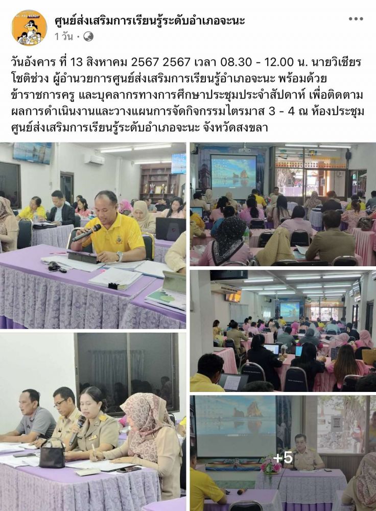 ศูนย์ สกร.ระดับอำเภอจะนะ วันอังคาร ที่ 13 สิงหาคม 2567 2567 เวลา 08.30 - 12.00 น. นายวิเชียร โชติช่วง ผู้อำนวยการศูนย์ส่งเสริมการเรียนรู้อำเภอจะนะ พร้อมด้วยข้าราชการครู และบุคลากรทางการศึกษาประชุมประจำสัปดาห์ เพื่อติดตามผลการดำเนินงานและวางแผนการจัดกิจกรรมไตรมาส 3 - 4 ณ ห้องประชุ