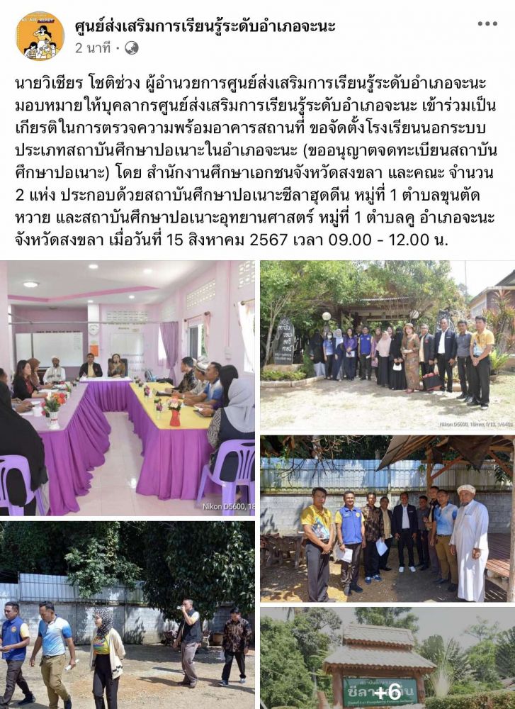 ศูนย์ สกร.ระดับอำเภอจะนะ เข้าร่วมเป็นเกียรติในการตรวจความพร้อมอาคารสถานที่ ขอจัดตั้งโรงเรียนนอกระบบ ประเภทสถาบันศึกษาปอเนาะในอำเภอจะนะ (ขออนุญาตจดทะเบียนสถาบันศึกษาปอเนาะ) โดย สำนักงานศึกษาเอกชนจังหวัดสงขลา