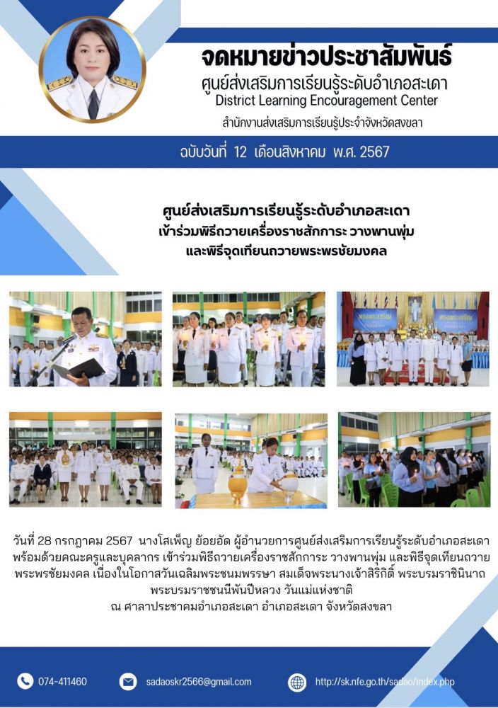 ศูนย์ส่งเสริมการเรียนรู้ระดับอำเภอสะเดา เข้าร่วมพิธีถวายเครื่องราชสักการะ วางพานพุ่ม และพิธีจุดเทียนถวายพระพรชัยมงคล