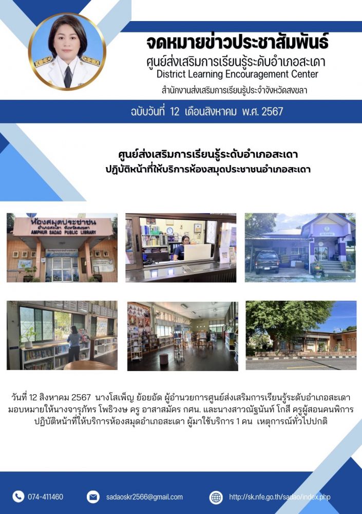 ศูนย์ส่งเสริมการเรียนรู้ระดับอำเภอสะเดา ปฏิบัติหน้าที่ให้บริการห้องสมุดประชาชนอำเภอสะเดา