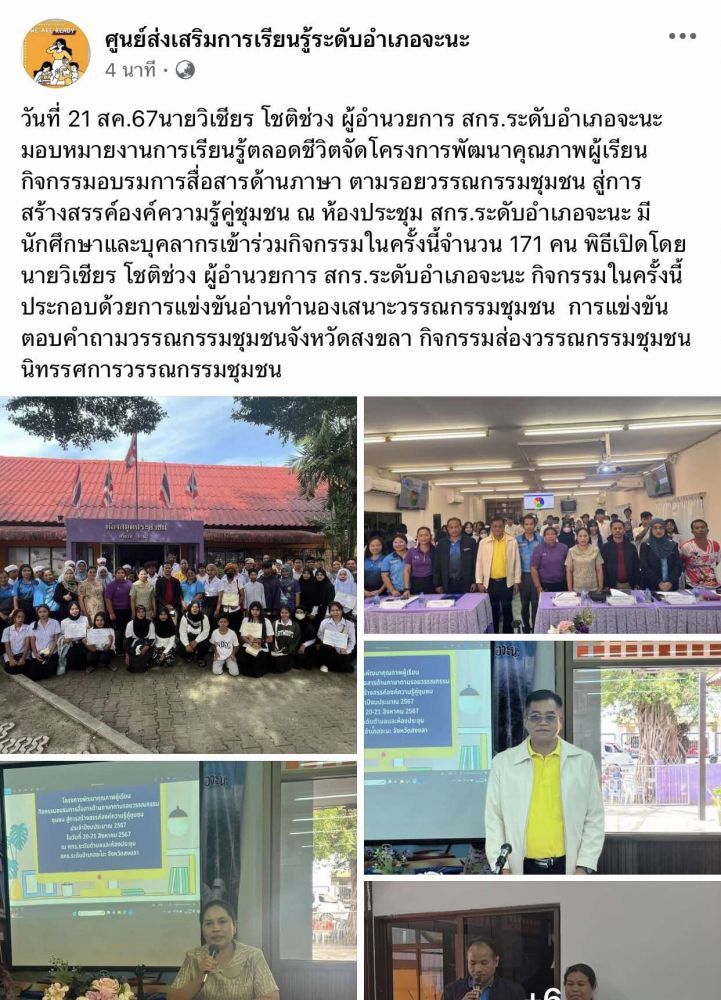 โครงการพัฒนาคุณภาพผู้เรียน กิจกรรมอบรมการสื่อสารด้านภาษา ตามรอยวรรณกรรมชุมชน สู่การสร้างสรรค์องค์ความรู้คู่ชุมชน ณ ห้องประชุม สกร.ระดับอำเภอจะนะ
