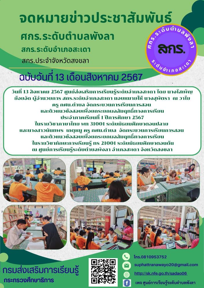ศูนย์ส่งเสริมการเรียนรู้ระดับอำเภอสะเดา ดกระบวนการเรียนการสอน และติวแนวข้อสอบเพื่อยกระยกผลสัมฤทธิ์ทางการเรียน ประจำภาคเรียนที่ 1 ปีการศึกษา 2567