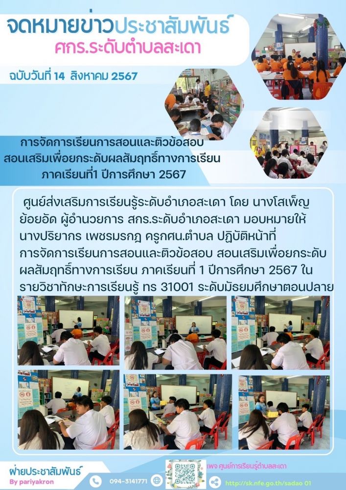 ศูนย์ส่งเสริมการเรียนรู้ระดับอำเภอสะเดา จัดกระบวนการเรียนการสอน และติวแนวข้อสอบเพื่อยกระยกผลสัมฤทธิ์ทางการเรียน ประจำภาคเรียนที่ 1 ปีการศึกษา 2567