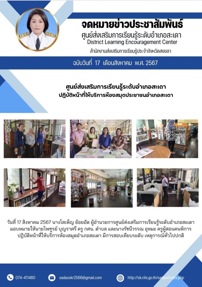 ศูนย์ส่งเสริมการเรียนรู้ระดับอำเภอสะเดา ปฏิบัติหน้าที่ให้บริการห้องสมุดประชาชนอำเภอสะเดา
