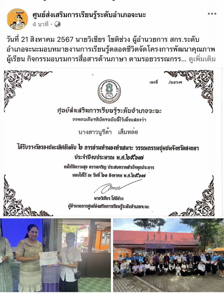 นางจีรวรรณ์ ปัตตะพัฒน์ ผู้อำนวยการศูนย์ส่งเสริมการเรียนรู้ระดับอำเภอจะนะ เข้าร่วมประชุมรับนโยบายและแนวทางการดำเนินงานส่งเสริมการเรียนรู้ ประจำปีงบประมาณ พ.ศ. 2569 พร้อมทั้งคณะบุคลากรสำนักงานส่งเสริมการเรียนรู้ประจำจังหวัดสงขลา ร่วมรับฟังนโยบายและแนวทางการ 7 / ต.ค. / 2568