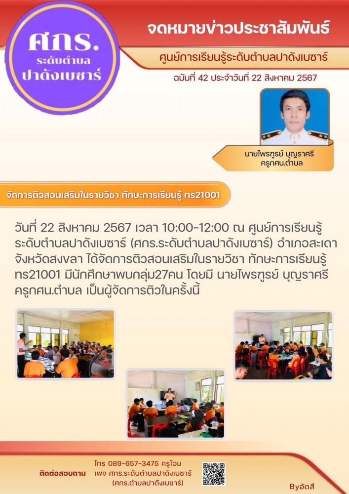 ศูนย์ส่งเสริมการเรียนรู้ระดับอำเภอสะเดา จัดการติวสอนเสริมในรายวิชา ทักษะการเรียนรู้ ทร21001