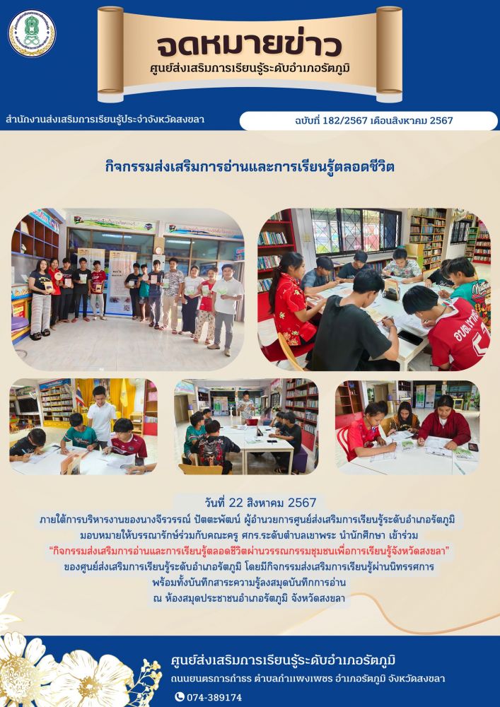 ศูนย์ สกร.ระดับอำเภอรัตภูมิ บรรณารักษ์ร่วมกับคณะครู ศกร.ระดับตำบลเขาพระ นำนักศึกษา เข้าร่วม กิจกรรมส่งเสริมการอ่านและการเรียนรู้ตลอดชีวิตผ่านวรรณกรรมชุมชนเพื่อการเรียนรู้จังหวัดสงขลา ของศูนย์ส่งเสริมการเรียนรู้ระดับอำเภอรัตภูมิ