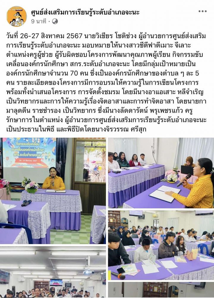 นางจีรวรรณ์ ปัตตะพัฒน์ ผู้อำนวยการศูนย์ส่งเสริมการเรียนรู้ระดับอำเภอจะนะ เข้าร่วมประชุมรับนโยบายและแนวทางการดำเนินงานส่งเสริมการเรียนรู้ ประจำปีงบประมาณ พ.ศ. 2569 พร้อมทั้งคณะบุคลากรสำนักงานส่งเสริมการเรียนรู้ประจำจังหวัดสงขลา ร่วมรับฟังนโยบายและแนวทางการ 7 / ต.ค. / 2568
