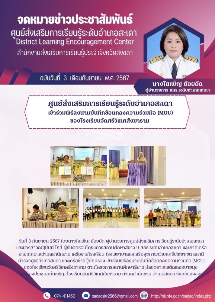 ศูนย์ส่งเสริมการเรียนรู้ระดับอำเภอสะเดา เข้าร่วมพิธีลงนามบันทึกข้อตกลงความร่วมมือ (MOU) ของโรงเรียนวัดศรีวิเทศสังฆาราม